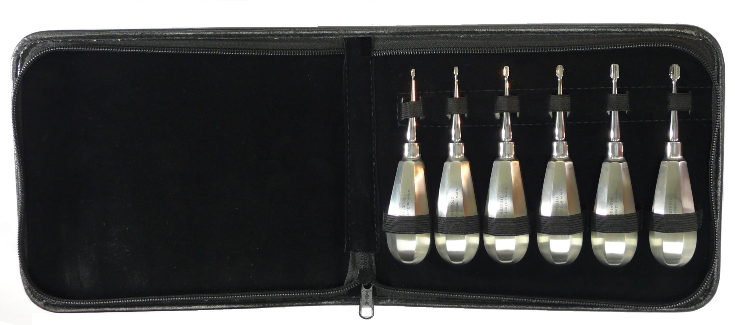 The 1-6 mm stubby handle elevators fit comfortably in the user’s hand (ideal for large or small hands) and allow the fore finger to be placed at the end of the instrument tip making extractions safer. Supplied in a black zipper pouch.