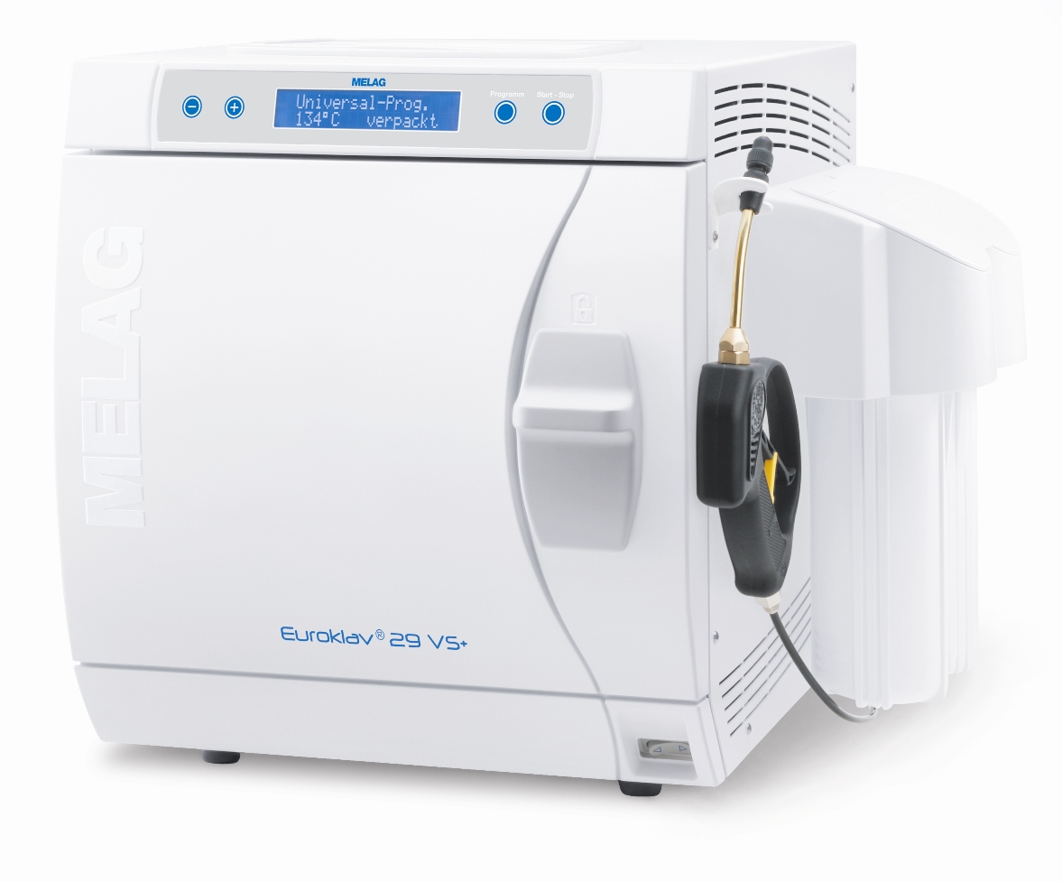 De MelaJet 40 wordt geleverd met een 1,5 meter lange slang die met een schroefaansluiting bevestigd kan worden aan Meladem 40. Tevens zijn er montagehulpstukken leverbaar voor bevestiging aan de wand, of aan een van de serie autoclaven van MELAG. Op die manier hangt de MelaJet altijd daar waar u hem nodig heeft.Dit sproeipistool kan tussen de autoclaaf en de MelaDem worden bevestigd. Op die manier kunt u uw instrumenten met gedemineraliseerd water afspoelen. Daarnaast kunt u de MelaJet gebruiken bij het verwisselen van harspatronen.