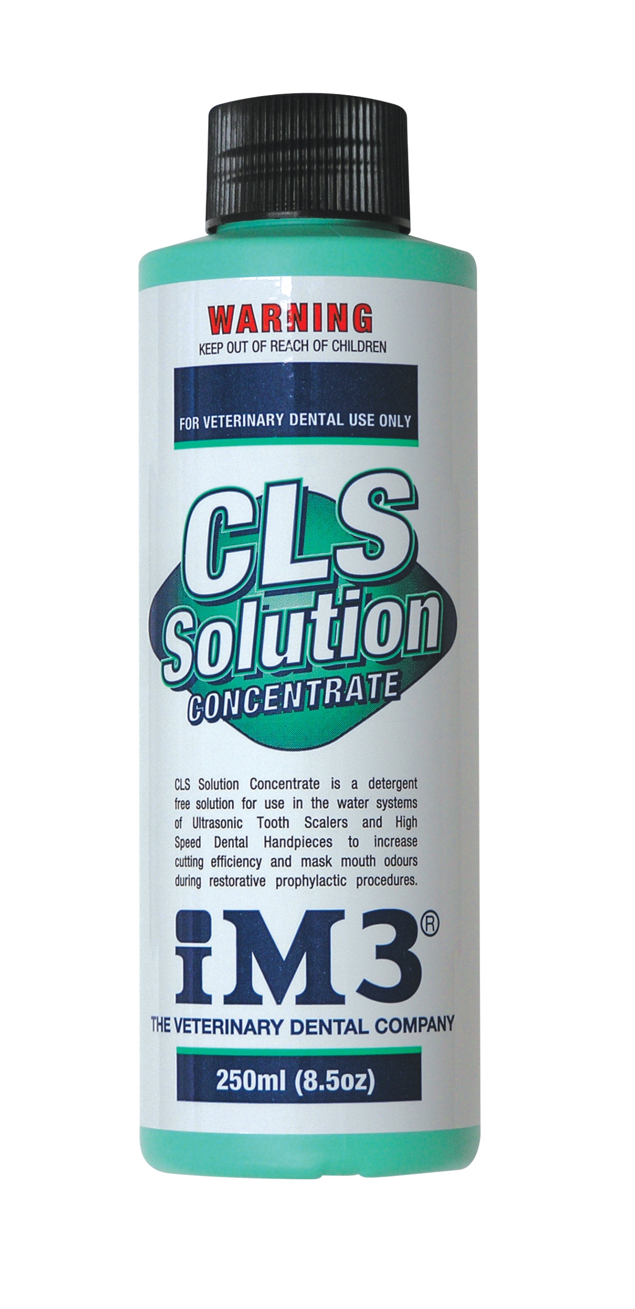 CLS is a uniquely formulated dental solution (concentrate) designed to reduce bur cutting time and mask mouth odours (spearmint). CLS contains chlorhexidine and can be used in the water supply of any dental machine or ultrasonic scaler. CLS is guaranteed when used at the correct dilution with distilled water not to block the water lines or coolant system of the dental machine. Easy to mix – just add distilled water to 1 bottle of CLS (250ml) to make 1L of working solution. Used and recommended in iM3 dental machines.