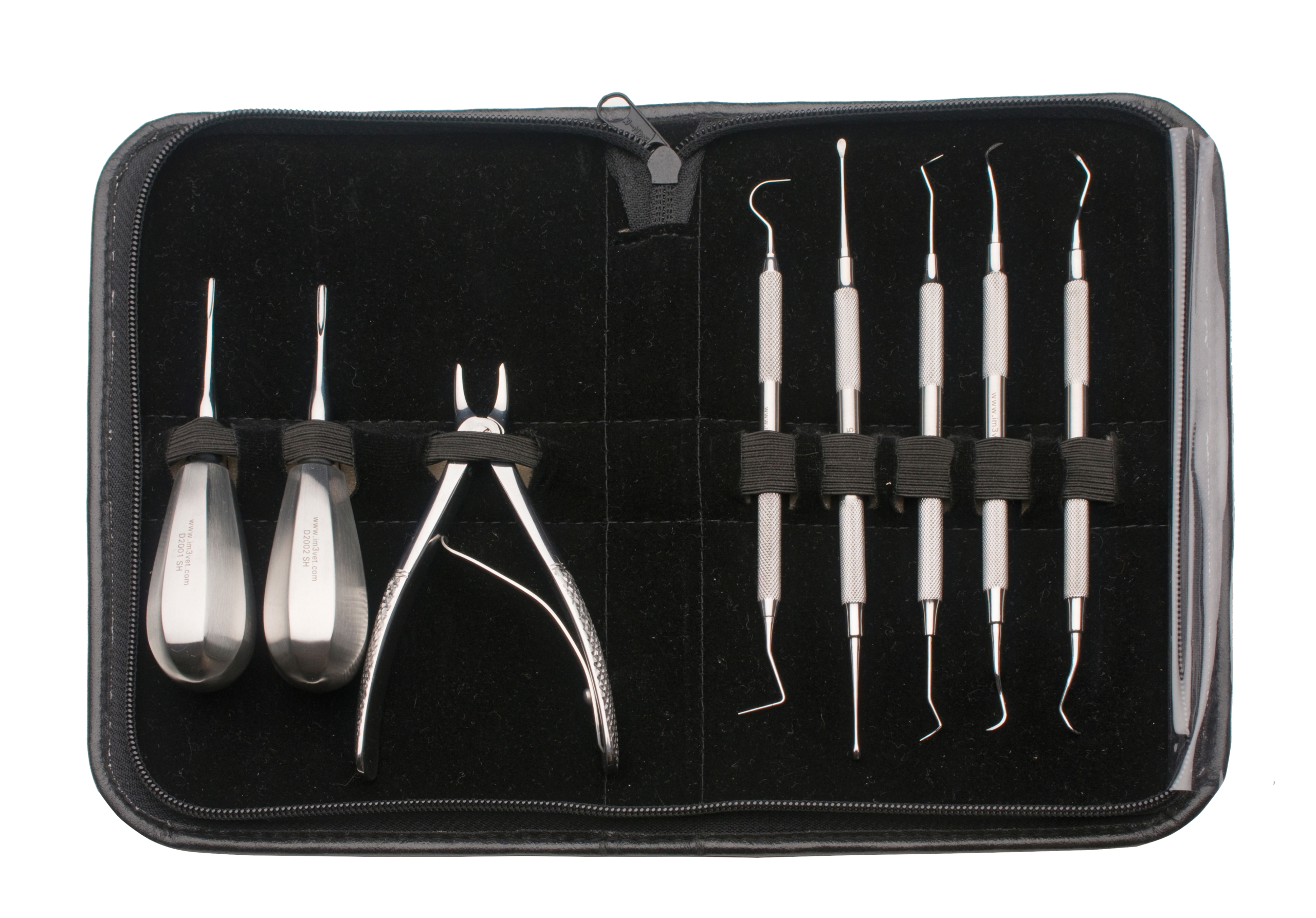 Complete Feline / small dog 8pc instrument set includes the instruments required to examine, scale and extract small teeth. Supplied in a black zipper case.