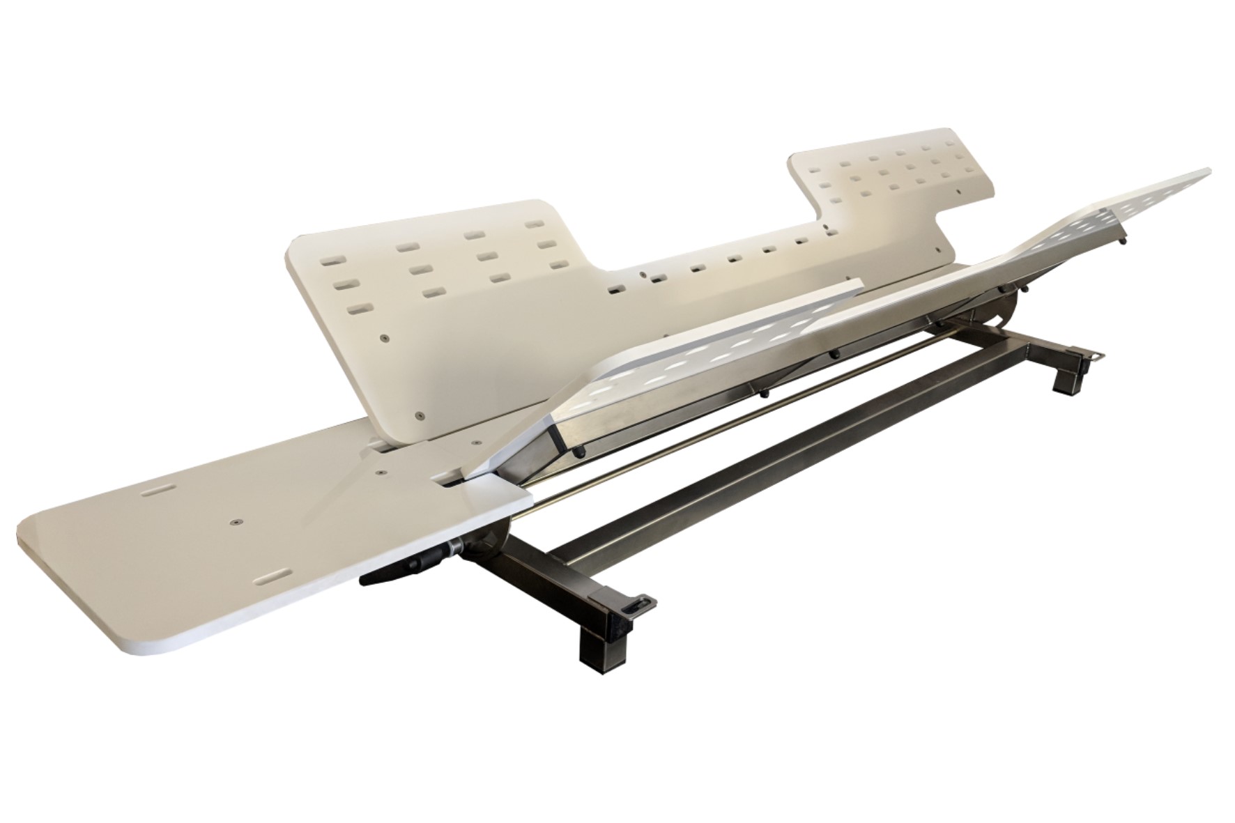 Opzet positioner voor laparoscopische ingrepen voor middelgrote tot grote honden. Deze positioner is mechanisch lateraal kantelbaar.