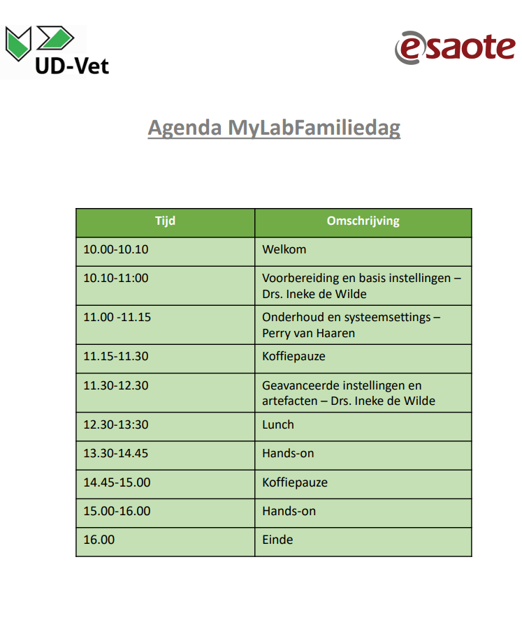 Van iedere dierenartsenpraktijk waarbij een Esaote echografietoestel is aangekocht mag 1 dierenarts eenmalig deelnemen aan de MyLabFamiliedag. In principe kunnen wij dus 1 dierenarts per praktijk inschrijven. Dit omdat wij een maximum aantal van 15 deelnemers kunnen plaatsen. Indien er plaatsen over zijn, kunnen wij in overleg besluiten of er een extra dierenarts voor een praktijk ingeschreven kan worden.