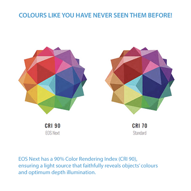 EOS Next has a 90% Color Rendering Index (CRI-90), ensuring a light source that faithfully reveals objects’ colours and optimum depth illumination.